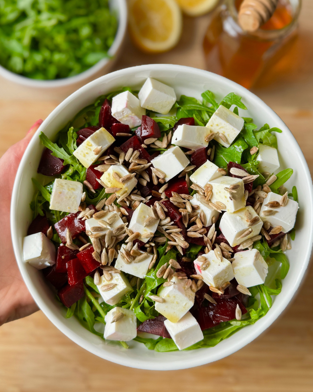 • Na talerzu ułóż rukolę, buraka i ser. Polej całość dressingiem i posyp nasionami słonecznika.